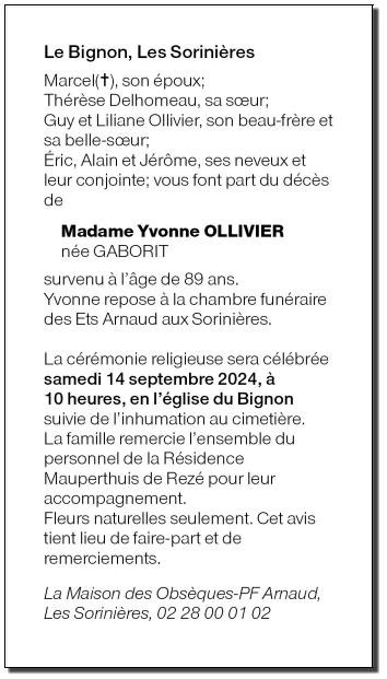 de Madame Yvonne OLLIVIER née GABORIT