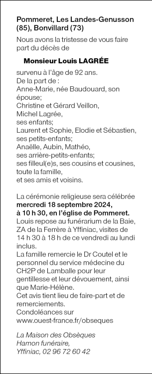 Cet espace « condoléances » est dédié à la mémoire de Monsieur Louis LAGRÉE.