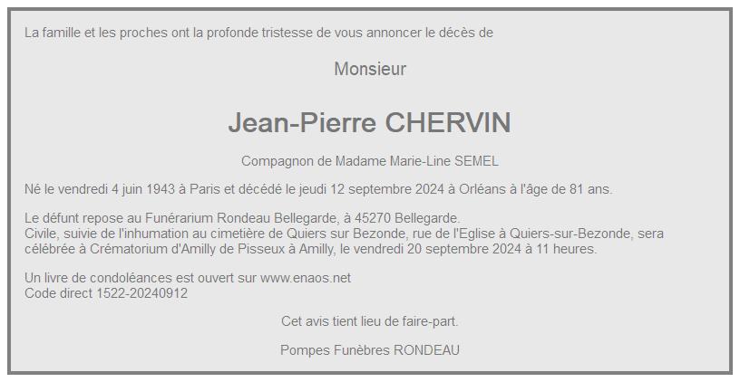 Cet espace « condoléances » est dédié à la mémoire de Monsieur Jean-Pierre CHERVIN.