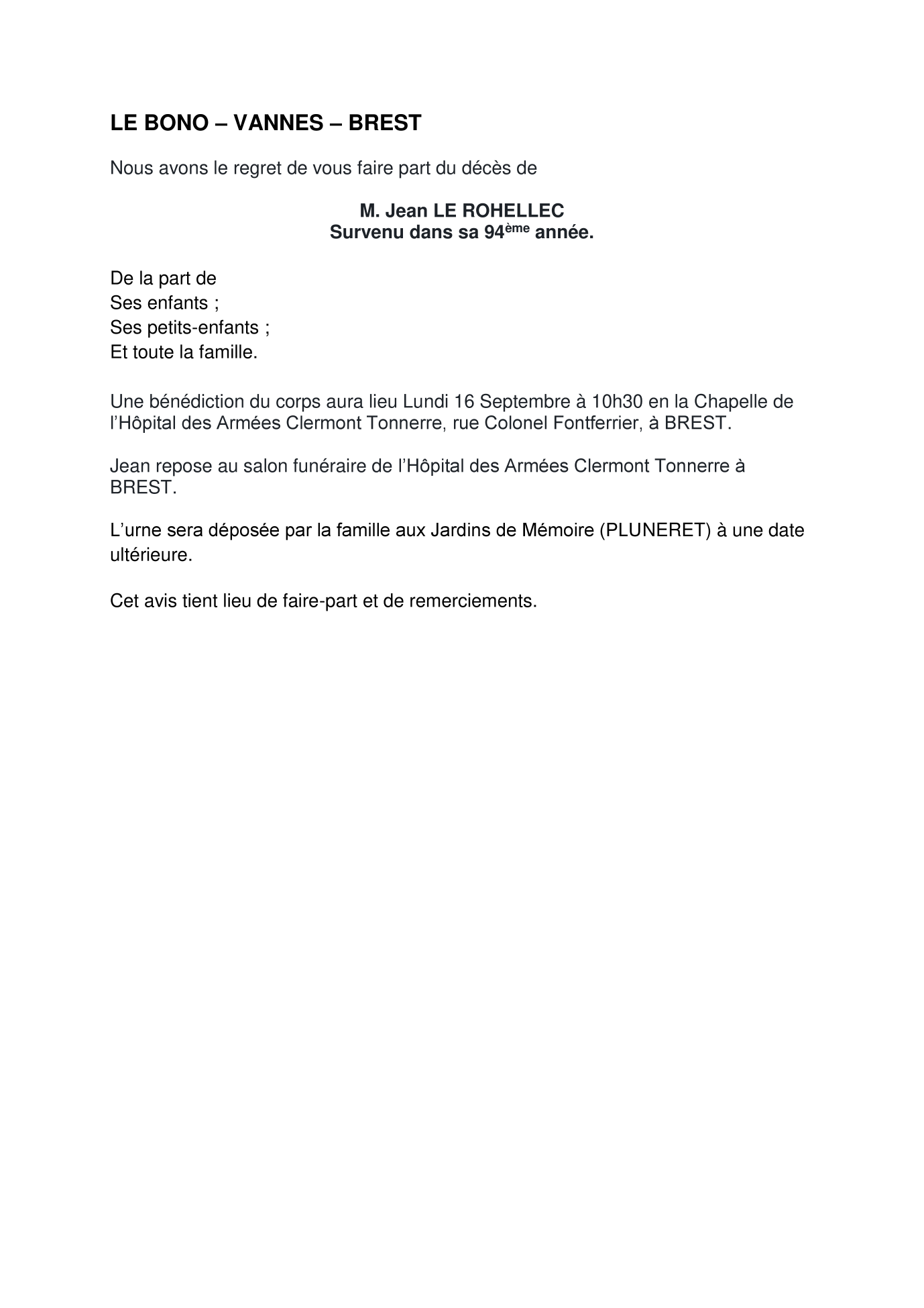 Cet espace « condoléances » est dédié à la mémoire de Monsieur Jean LE ROHELLEC.