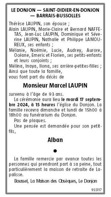 Cet espace « condoléances » est dédié à la mémoire de Monsieur Marcel LAUPIN.