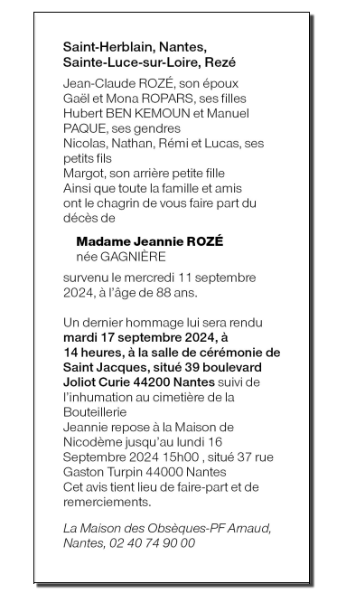 de Madame Jeannie ROZÉ née GAGNIERE