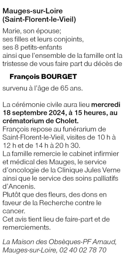 Cet espace « condoléances » est dédié à la mémoire de Monsieur François BOURGET.