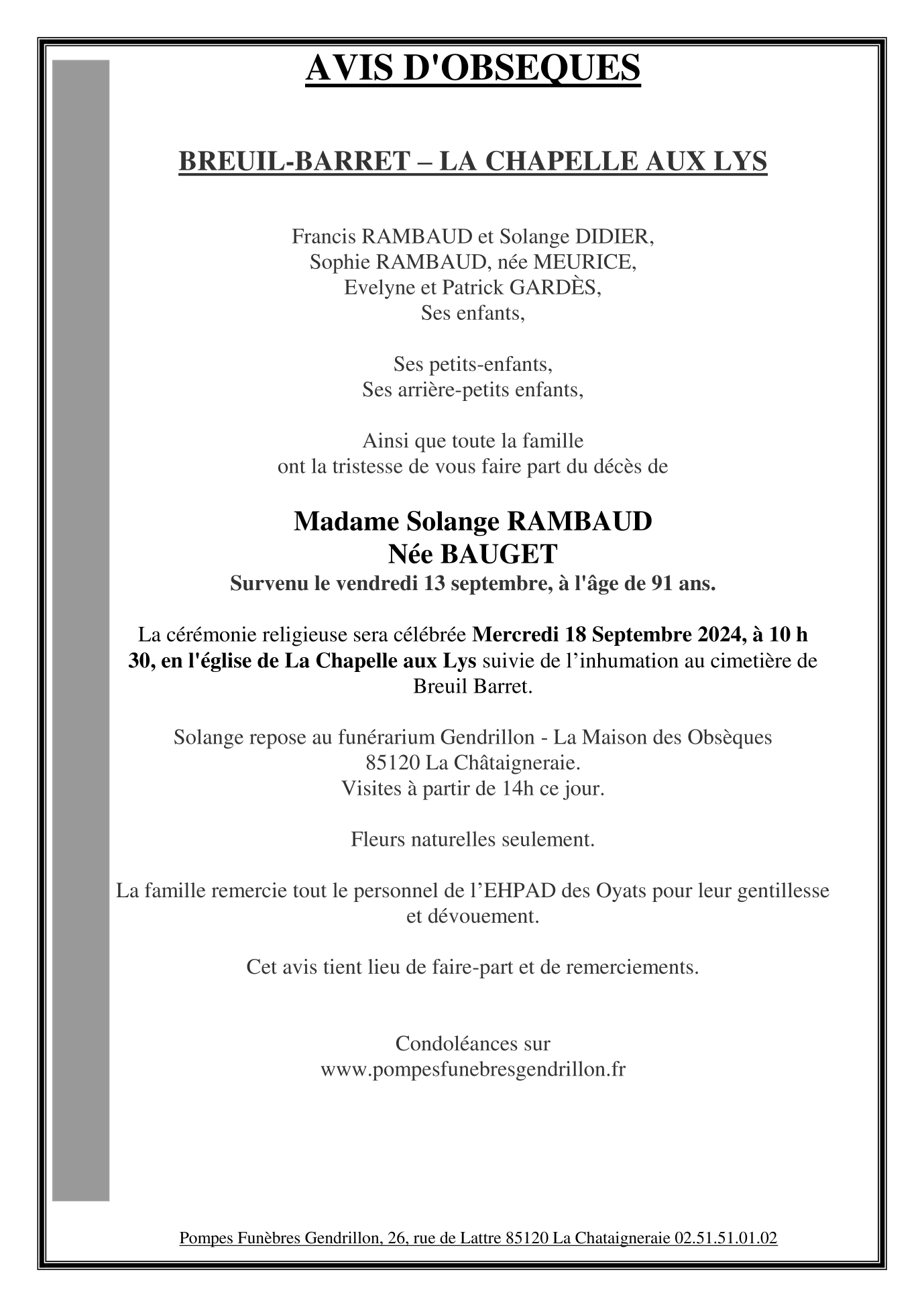 Cet espace « condoléances » est dédié à la mémoire de Madame Solange RAMBAUD née BAUGET.