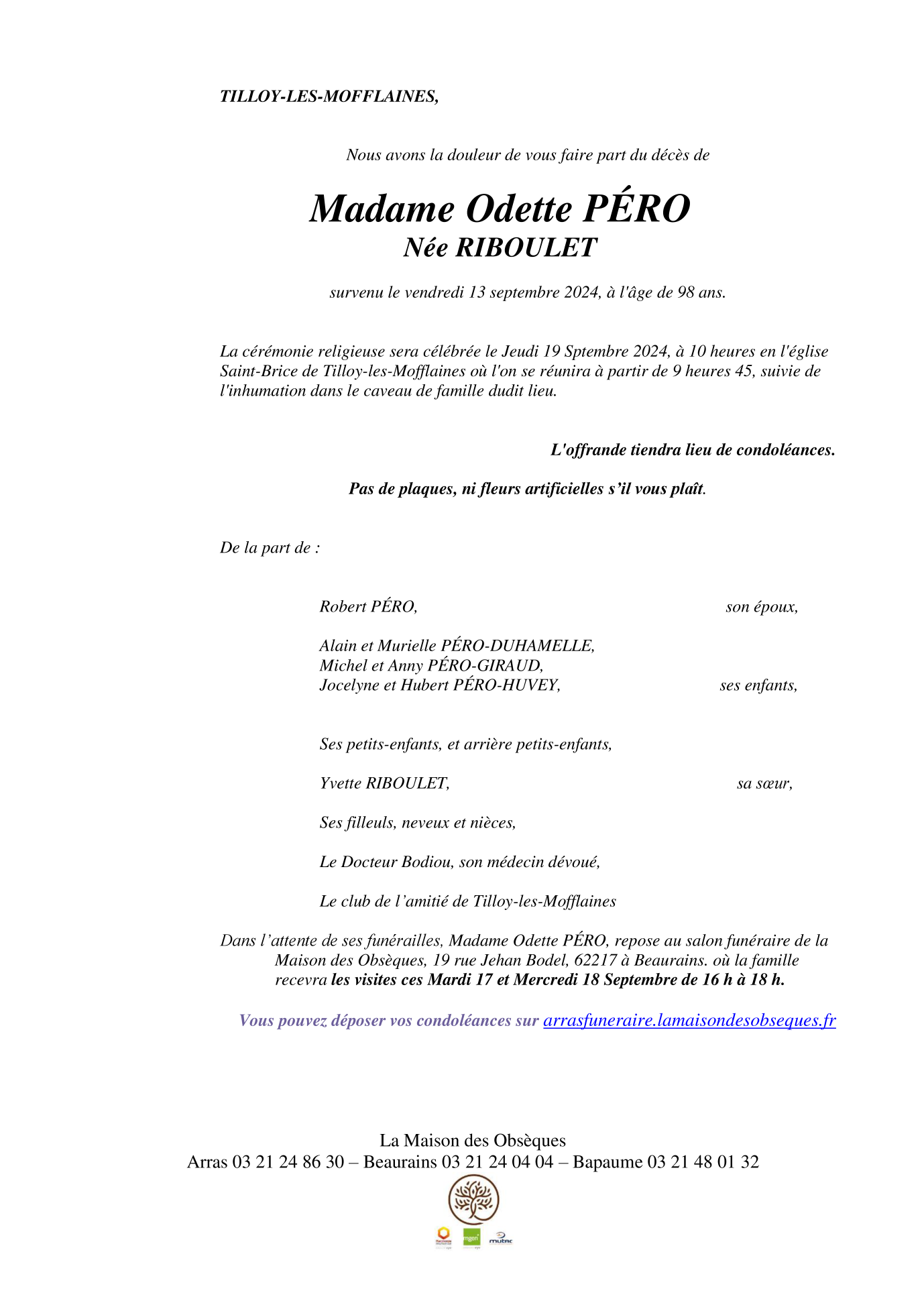 de Madame Odette PÉRO née RIBOULET