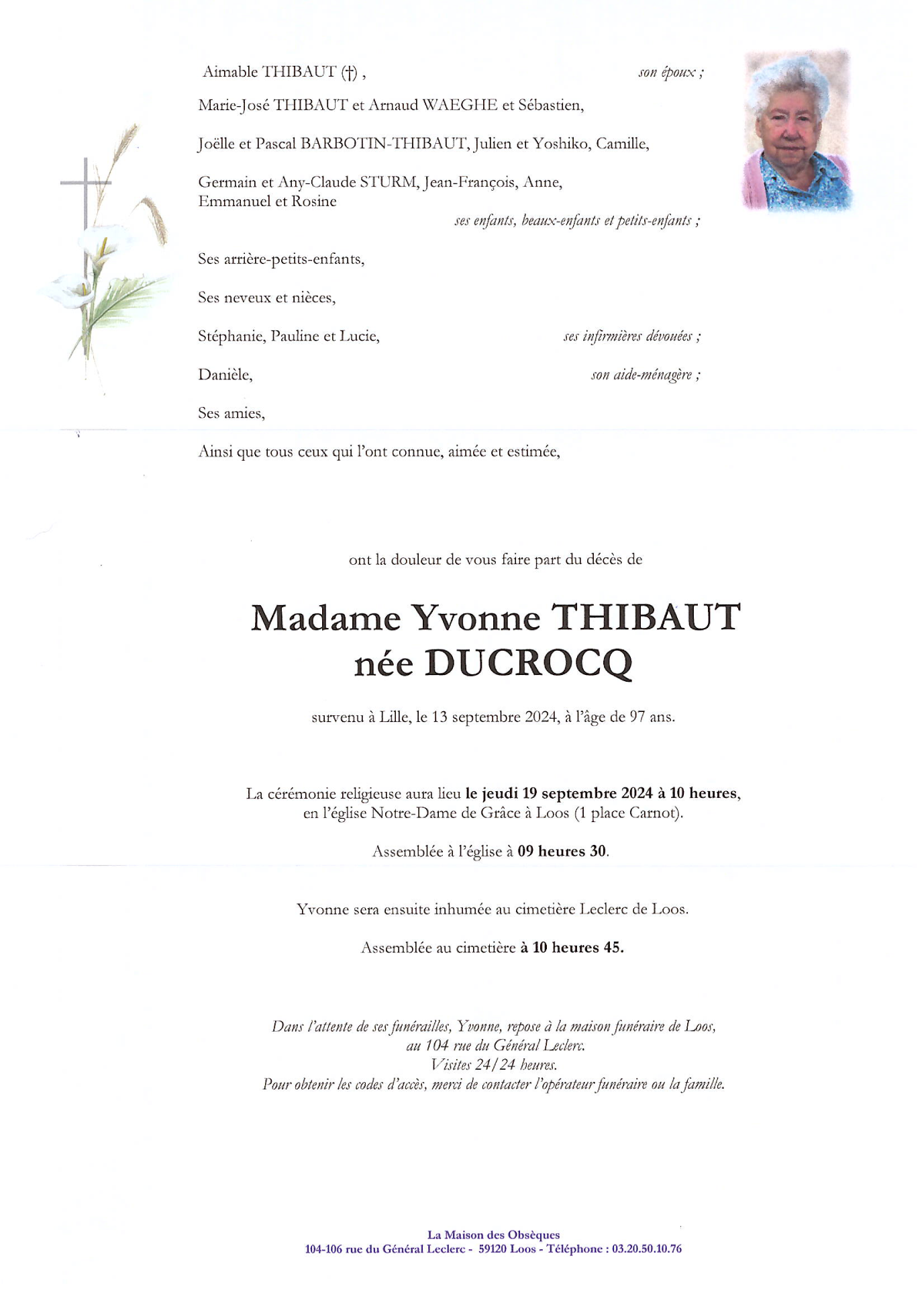 Cet espace « condoléances » est dédié à la mémoire de Madame Yvonne THIBAUT née DUCROCQ.