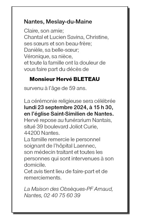 Cet espace « condoléances » est dédié à la mémoire de Monsieur Hervé BLETEAU.