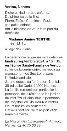 Cet espace « condoléances » est dédié à la mémoire de Madame Janine TERTRE née TERTE.