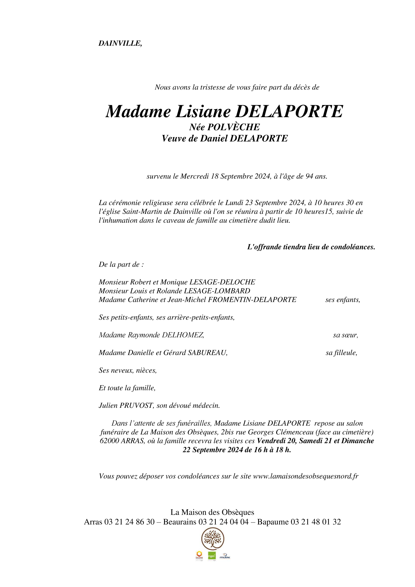 de Madame Lisiane DELAPORTE née POLVÉCHE
