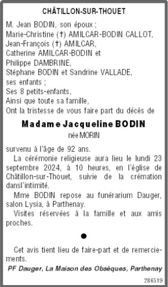 de Madame Jacqueline BODIN née MORIN