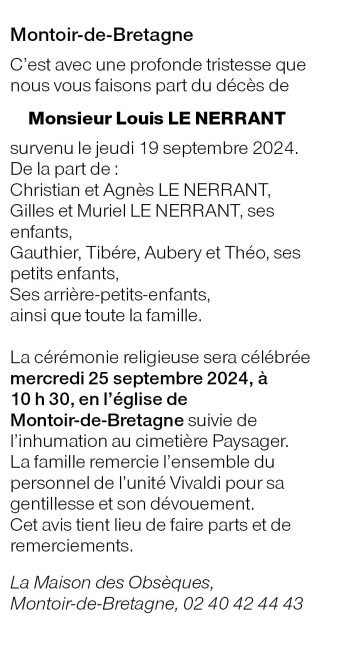 Cet espace « condoléances » est dédié à la mémoire de Monsieur Louis LE NERRANT.