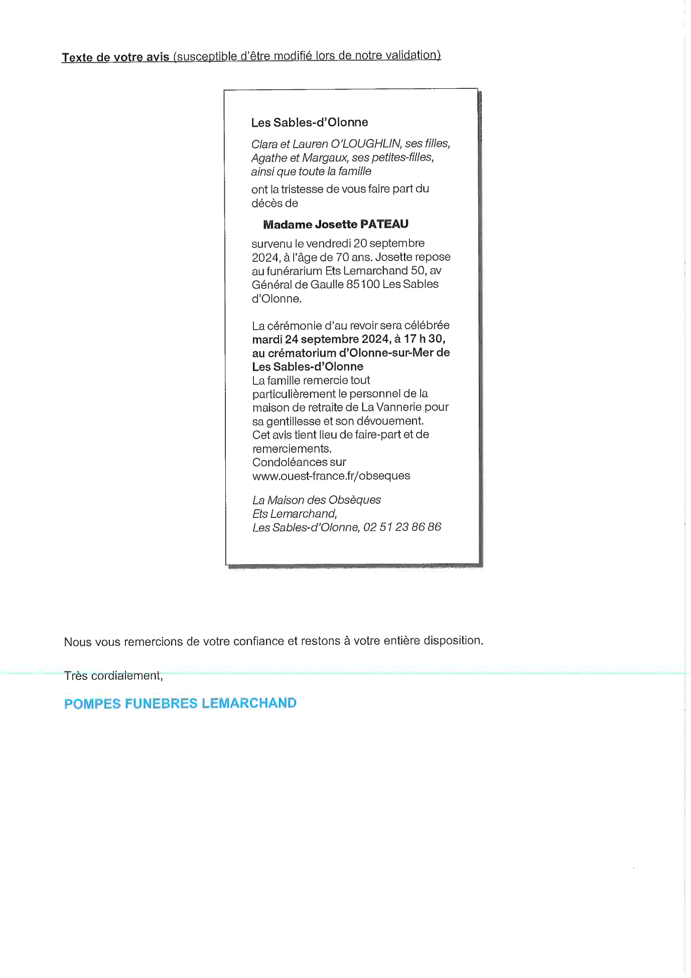 Cet espace « condoléances » est dédié à la mémoire de Madame Josette PATEAU.
