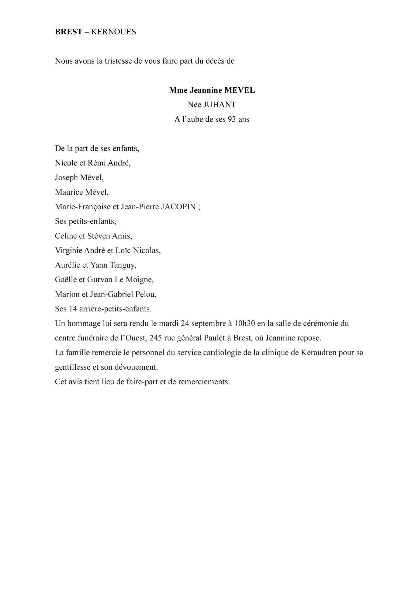 de Madame Jeannine MEVEL née JUHANT