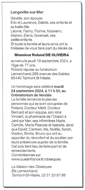 Cet espace « condoléances » est dédié à la mémoire de Monsieur Roland DE OLIVEIRA.