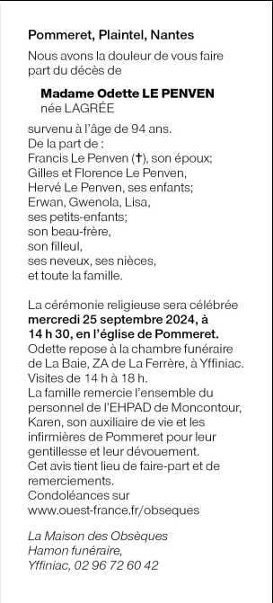 Cet espace « condoléances » est dédié à la mémoire de Madame Odette LE PENVEN née LAGRÉE.