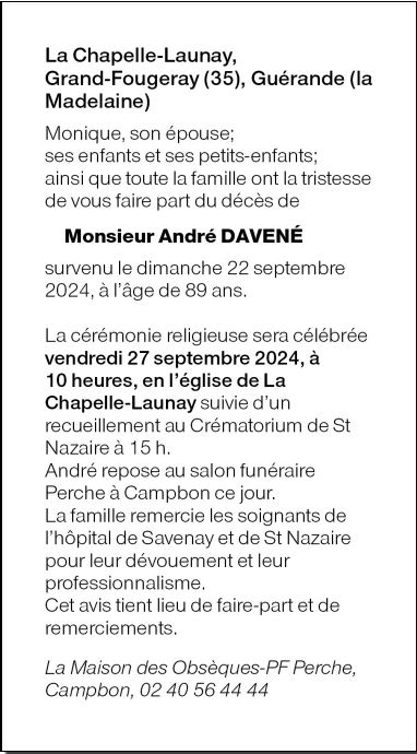 Décédé à Savenay (44260) le dimanche 22 septembre 2024