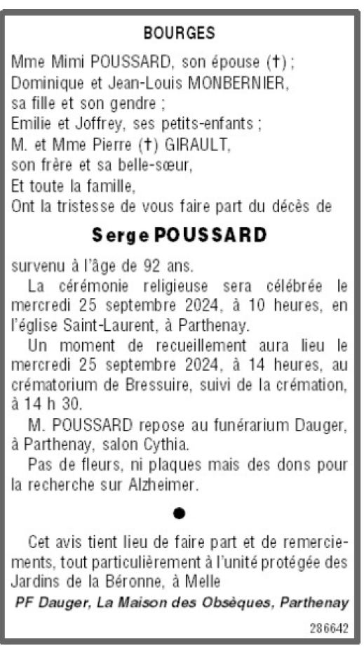 Cet espace « condoléances » est dédié à la mémoire de Monsieur Serge POUSSARD.