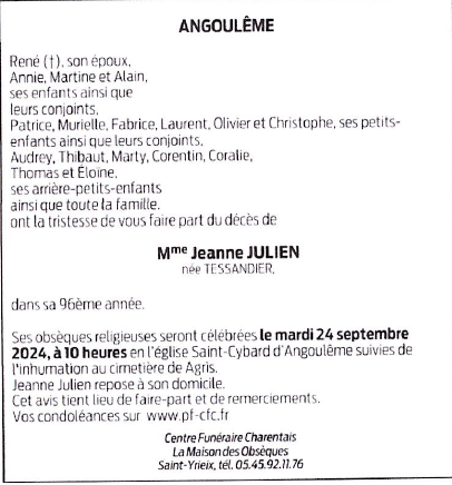 Cet espace « condoléances » est dédié à la mémoire de Madame Jeanne JULIEN née TESSANDIER.