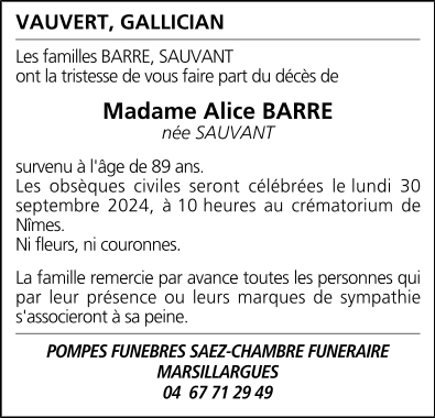 Cet espace « condoléances » est dédié à la mémoire de Madame Alice BARRE née SAUVANT.