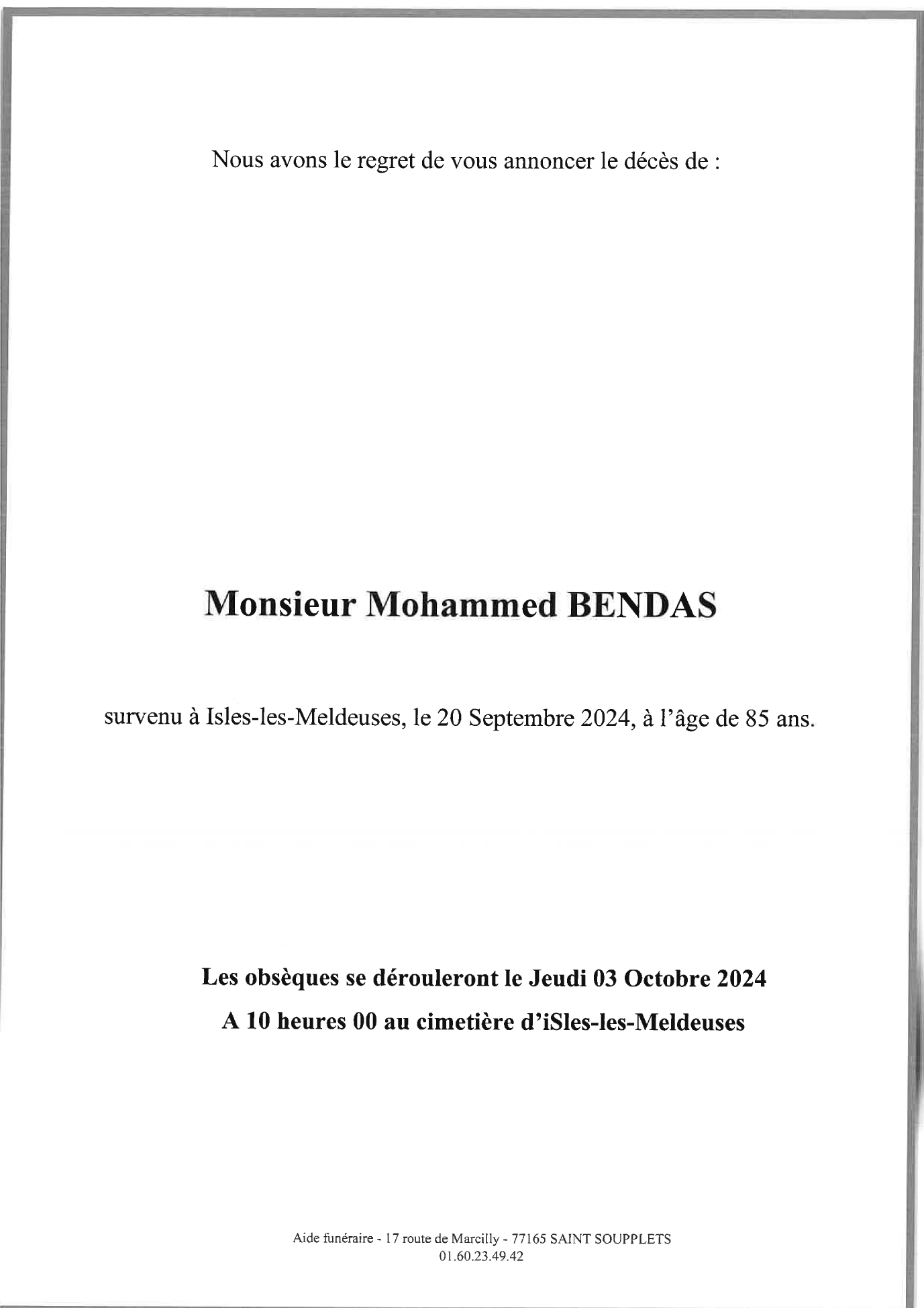 Cet espace « condoléances » est dédié à la mémoire de Monsieur Mohammed BENDAS.