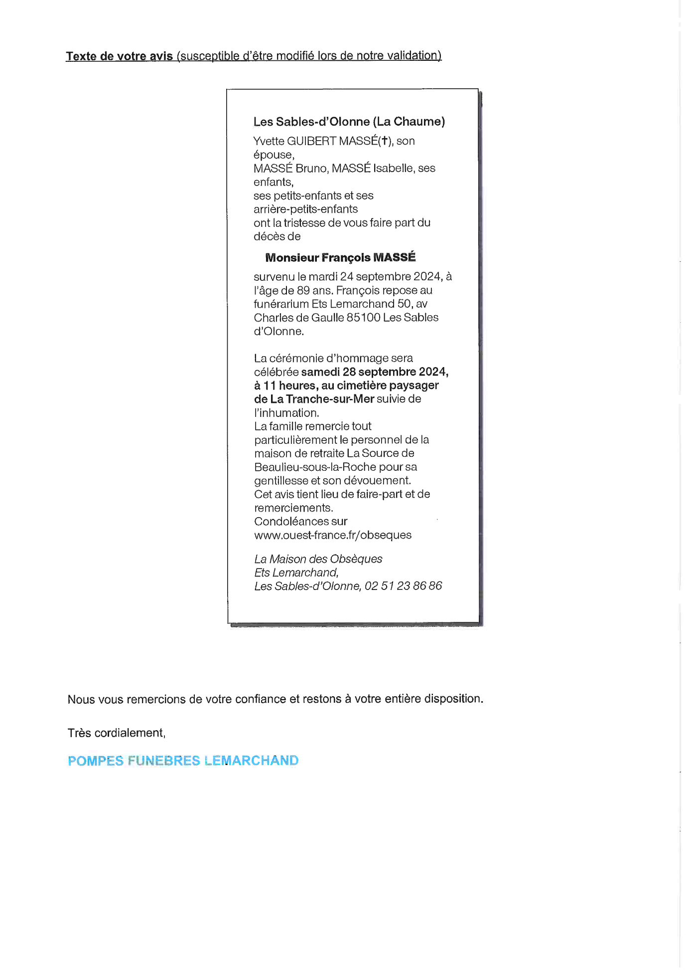 Cet espace « condoléances » est dédié à la mémoire de Monsieur François MASSÉ.