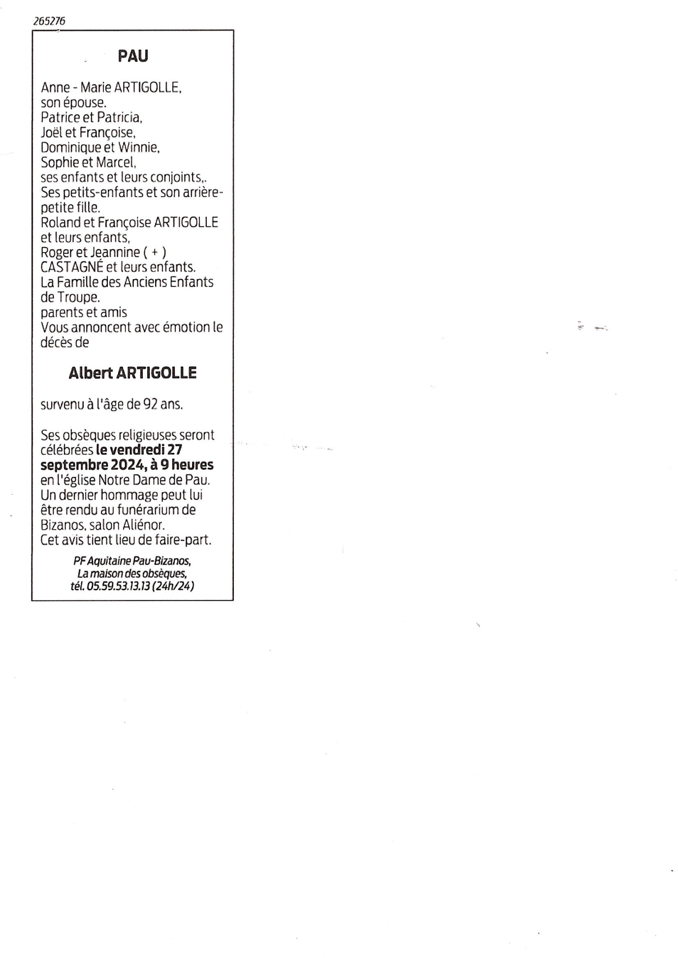 Cet espace « condoléances » est dédié à la mémoire de Monsieur Albert ARTIGOLLE.