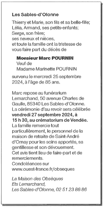 Cet espace « condoléances » est dédié à la mémoire de Monsieur Marc POURNIN.