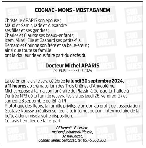 Cet espace « condoléances » est dédié à la mémoire de Monsieur Michel APARIS.