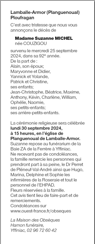 Cet espace « condoléances » est dédié à la mémoire de Madame Suzanne MICHEL née COUZIGOU.