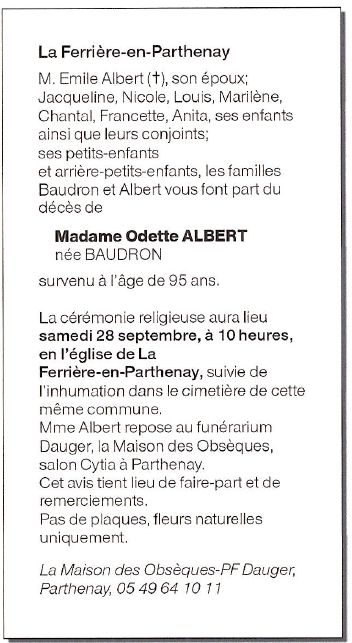 Cet espace « condoléances » est dédié à la mémoire de Madame Odette ALBERT née BAUDRON.