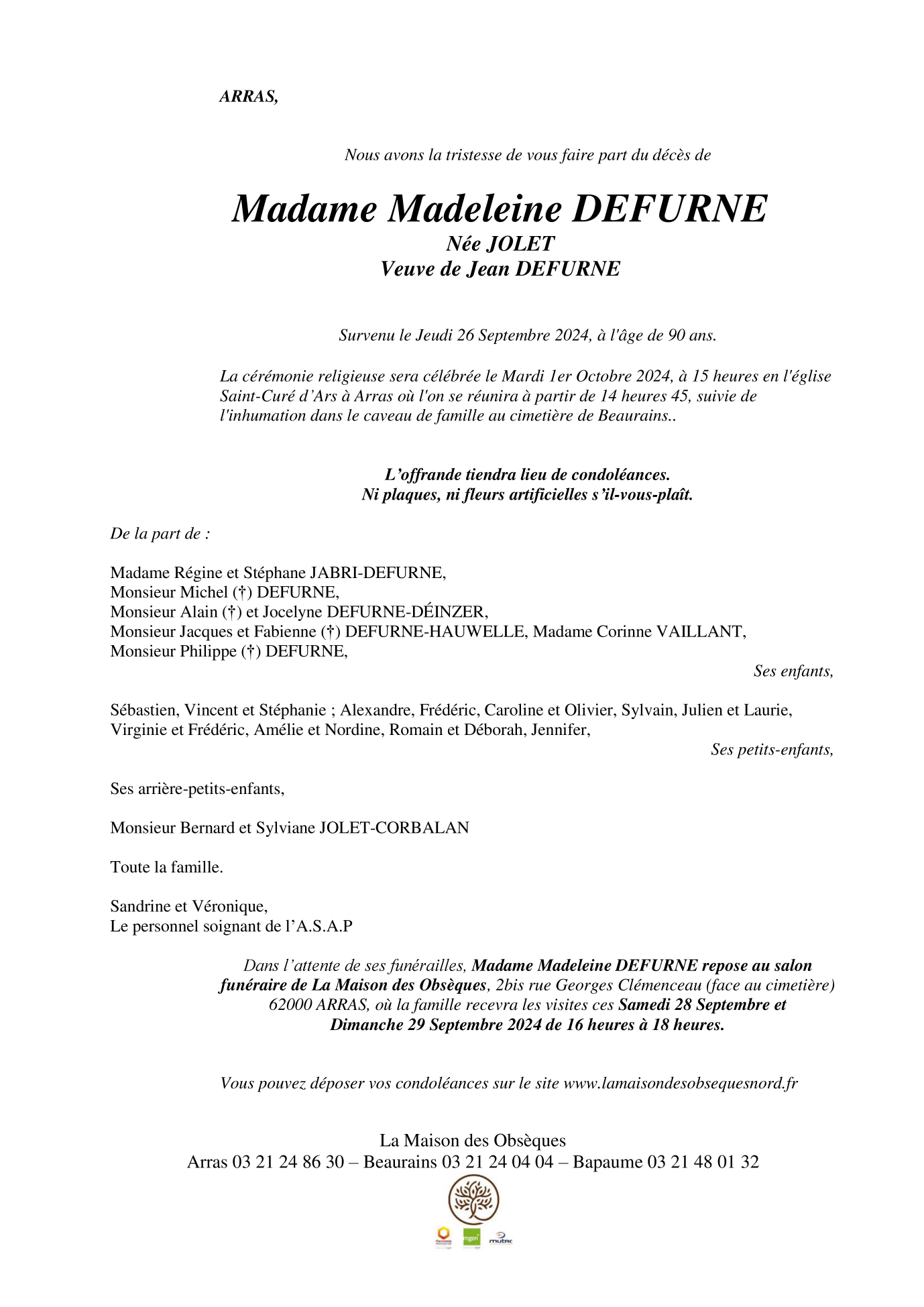 Cet espace « condoléances » est dédié à la mémoire de Madame Madeleine DEFURNE née JOLET.