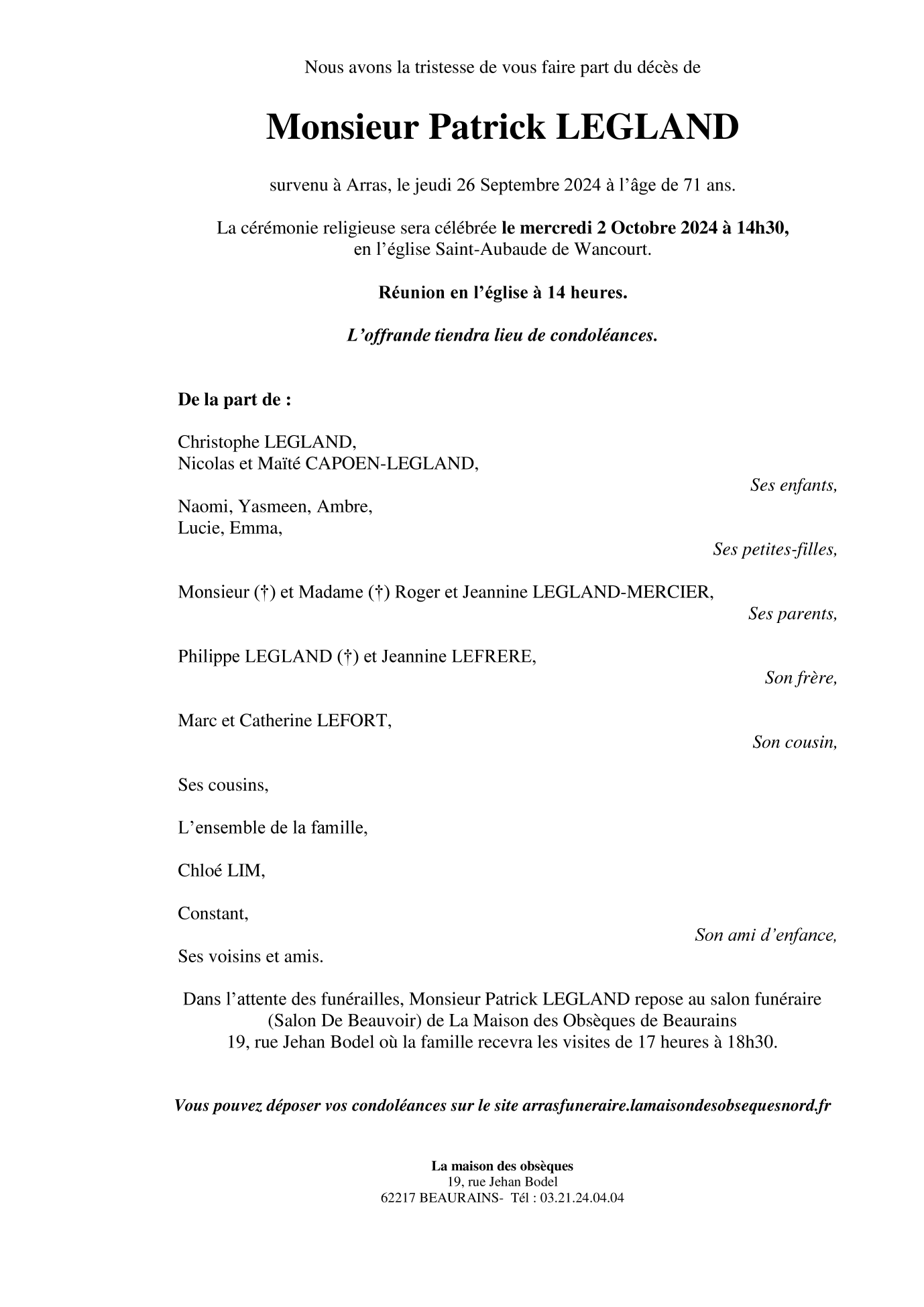 Cet espace « condoléances » est dédié à la mémoire de Monsieur Patrick LEGLAND.