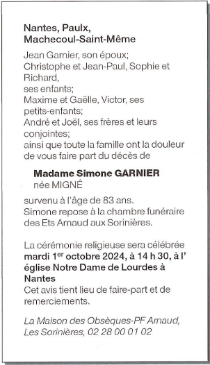 de Madame Simone GARNIER née MIGNÉ
