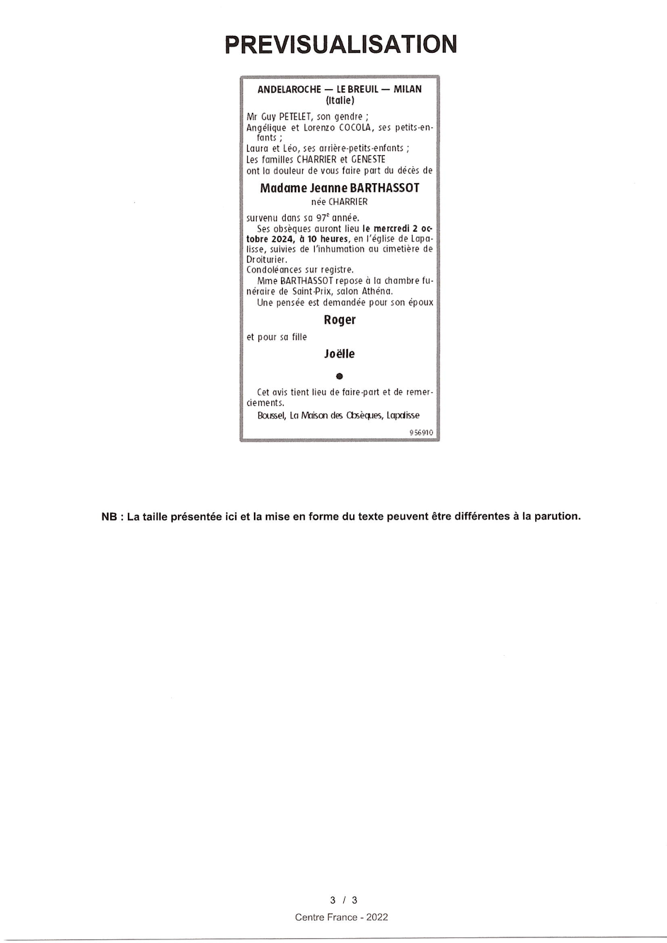 de Madame Jeanne BARTHASSOT née CHARRIER