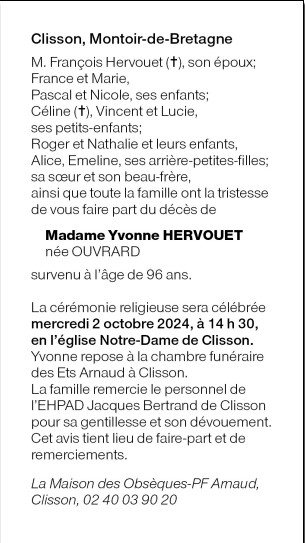 de Madame Yvonne HERVOUET née OUVRARD