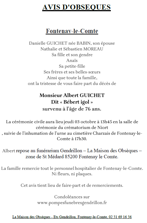 Décédé à Fontenay-le-Comte (85200) le samedi 28 septembre 2024