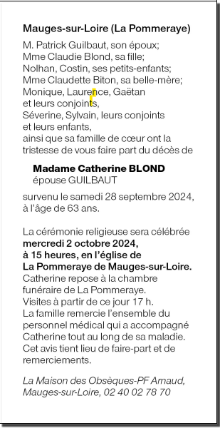 Cet espace « condoléances » est dédié à la mémoire de Madame Catherine GUILBAUT née BLOND.