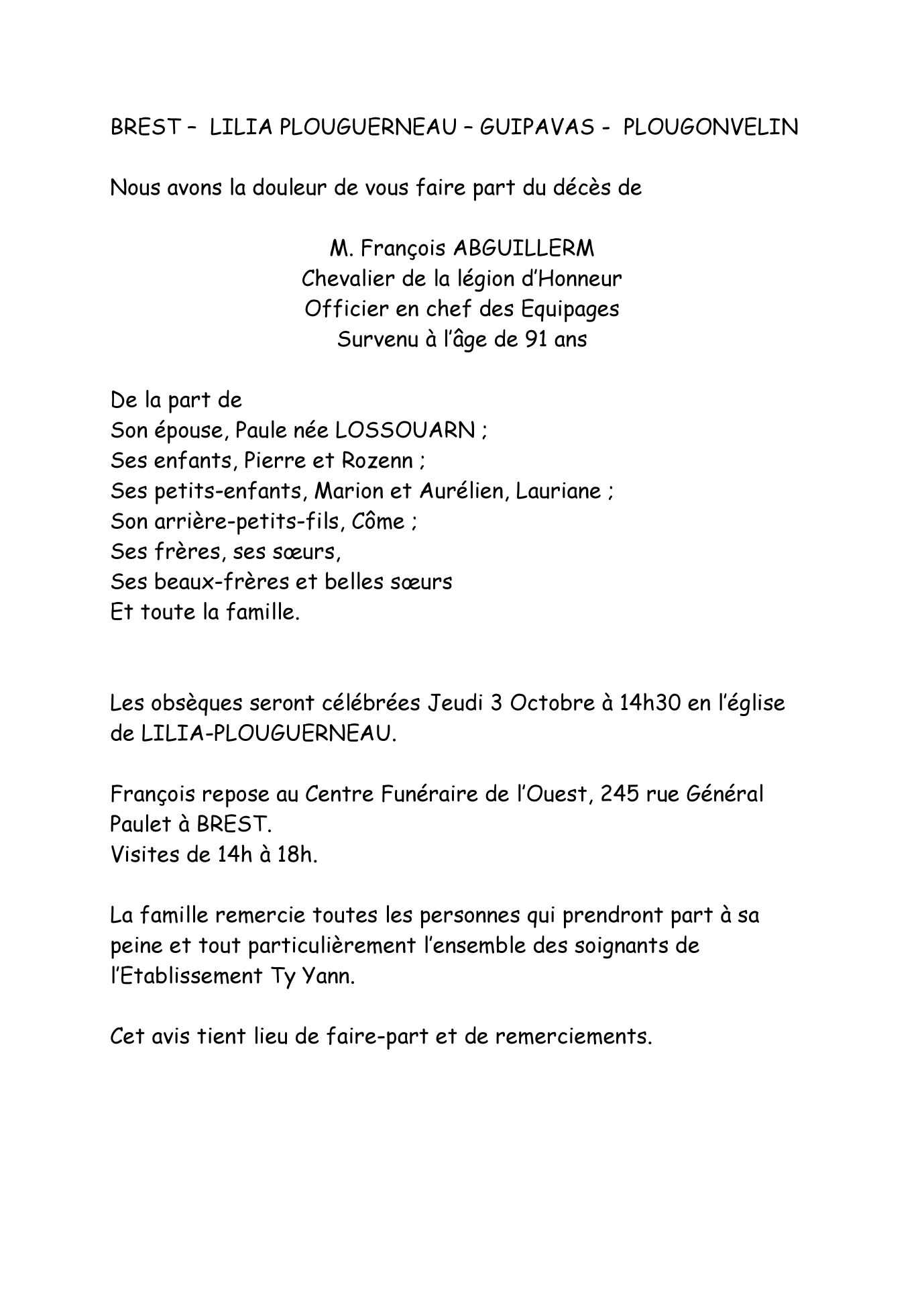 Cet espace « condoléances » est dédié à la mémoire de Monsieur François ABGUILLERM.