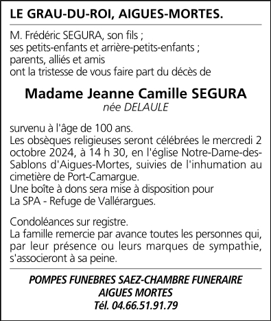 Cet espace « condoléances » est dédié à la mémoire de Madame Jeanne SEGURA née DELAULE.