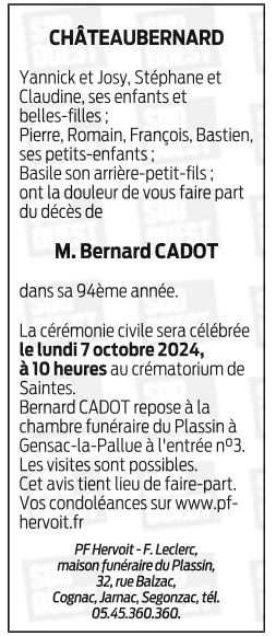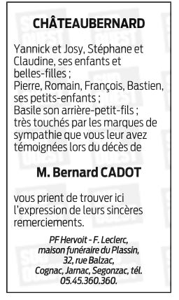 Cet espace « condoléances » est dédié à la mémoire de Monsieur Bernard CADOT.