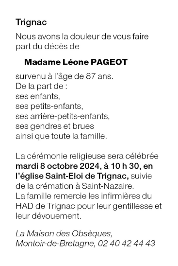 Cet espace « condoléances » est dédié à la mémoire de Madame Leone PAGEOT née MOYON.