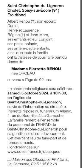 Cet espace « condoléances » est dédié à la mémoire de Madame Pierrette RENOU née ORCEAU.