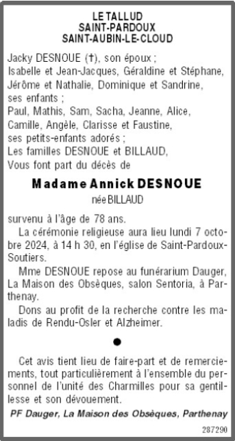 de Madame Marie-Josèphe DESNOUE née BILLAUD