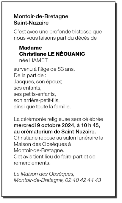 Cet espace « condoléances » est dédié à la mémoire de Madame Christiane LE NÉOUANIC née HAMET.