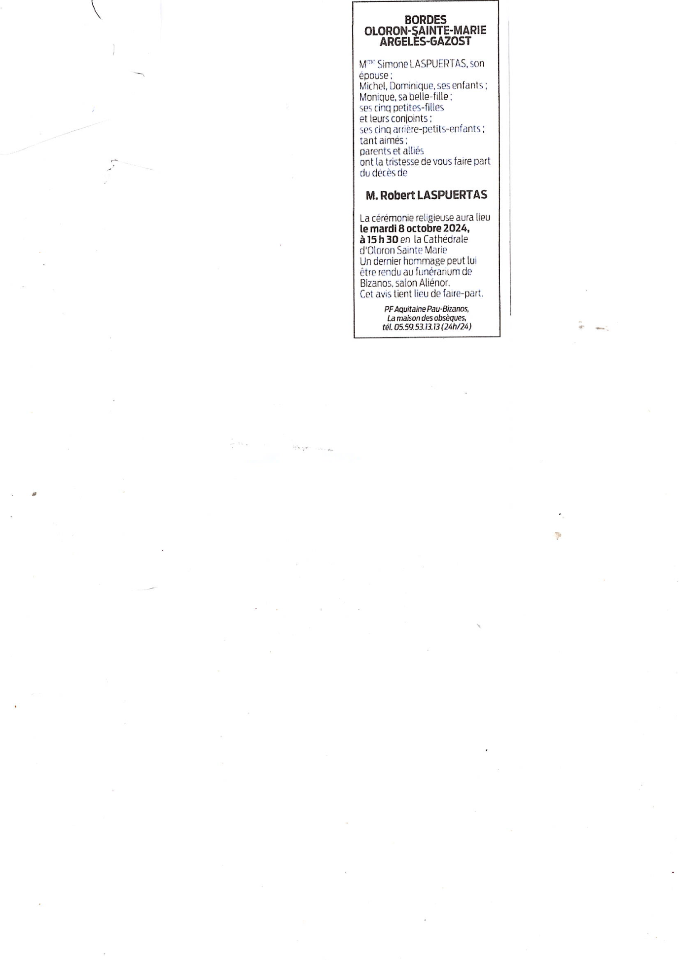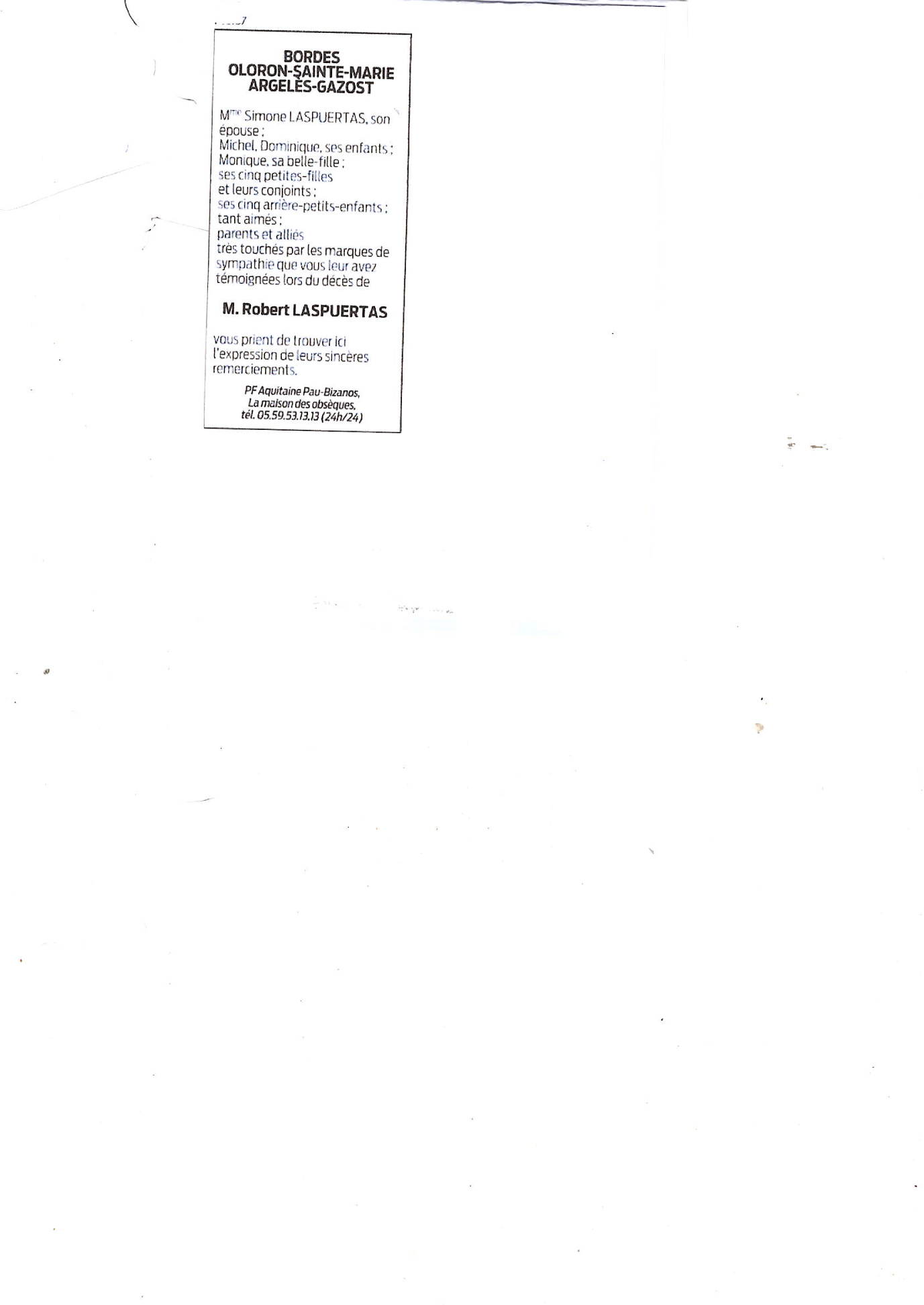 Cet espace « condoléances » est dédié à la mémoire de Monsieur Robert LASPUERTAS - WRISEZ.