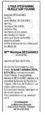 Cet espace « condoléances » est dédié à la mémoire de Madame Monique DESSAGNES née MARTIN.