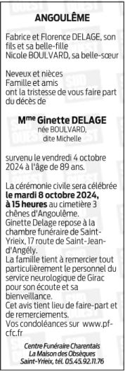 Décédée à Saint-Michel (16470) le vendredi 4 octobre 2024