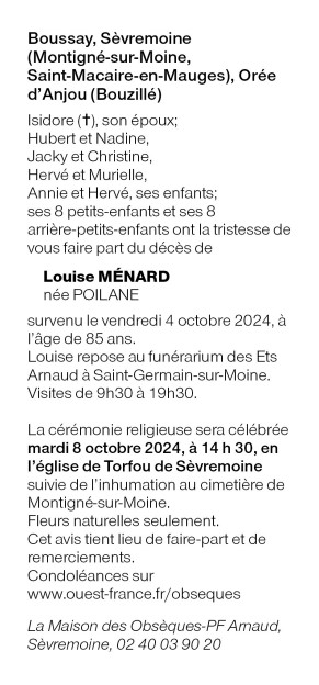 Cet espace « condoléances » est dédié à la mémoire de Madame Louise MÉNARD née POILÂNE.