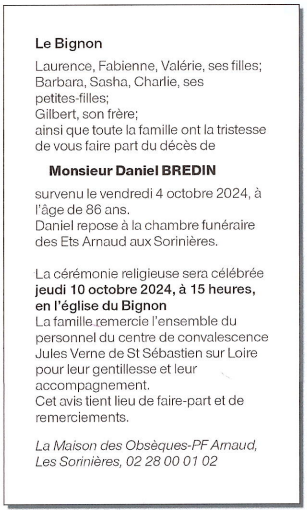 Cet espace « condoléances » est dédié à la mémoire de Monsieur Daniel BREDIN.