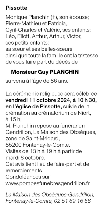 Décédé à Pissotte (85200) le samedi 5 octobre 2024